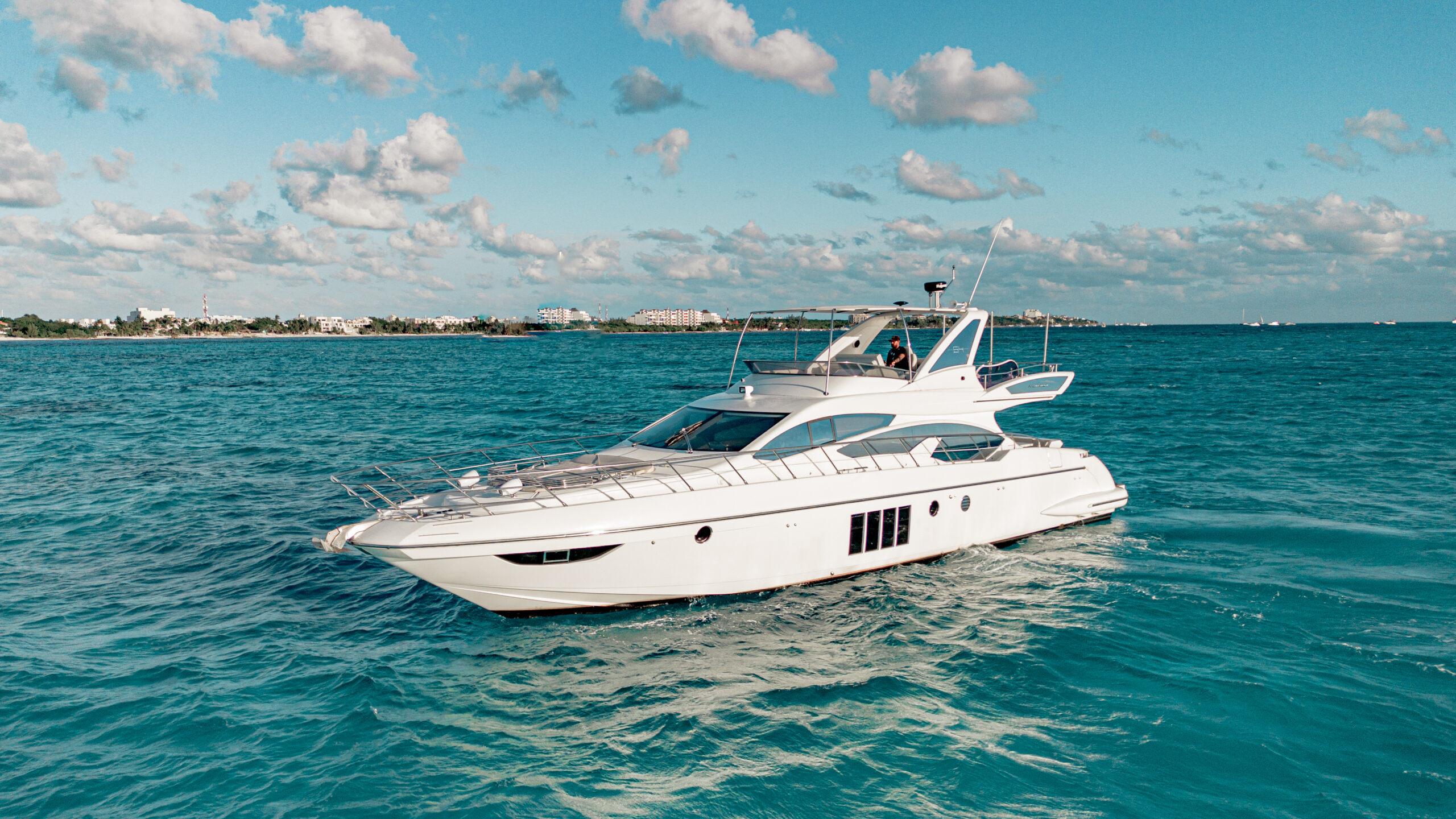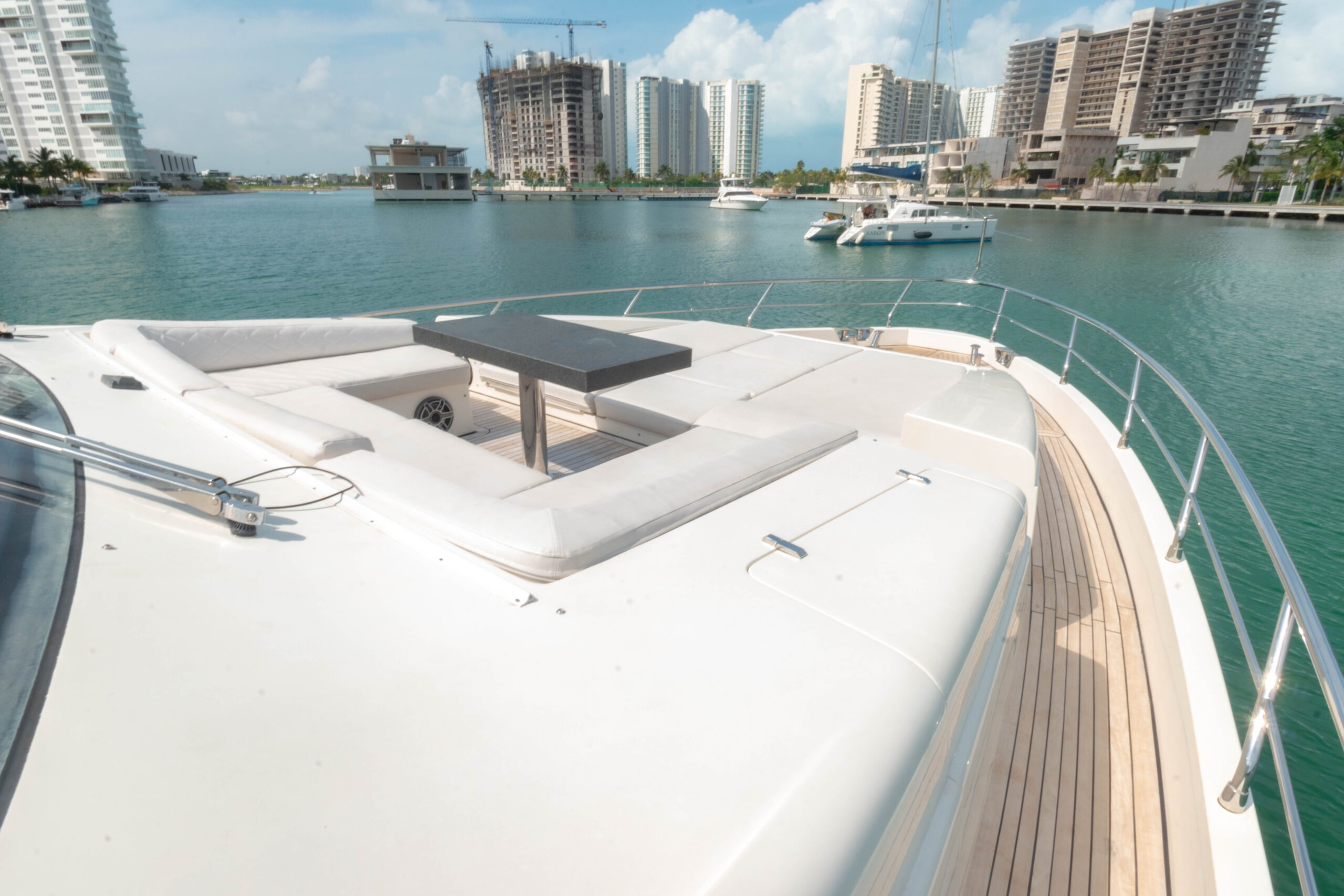 Cuenta con 3 camarotes, 3 baños completos, aire acondicionado, TV, y un espectacular flybridge con barra para disfrutar de la vista y el ambiente.